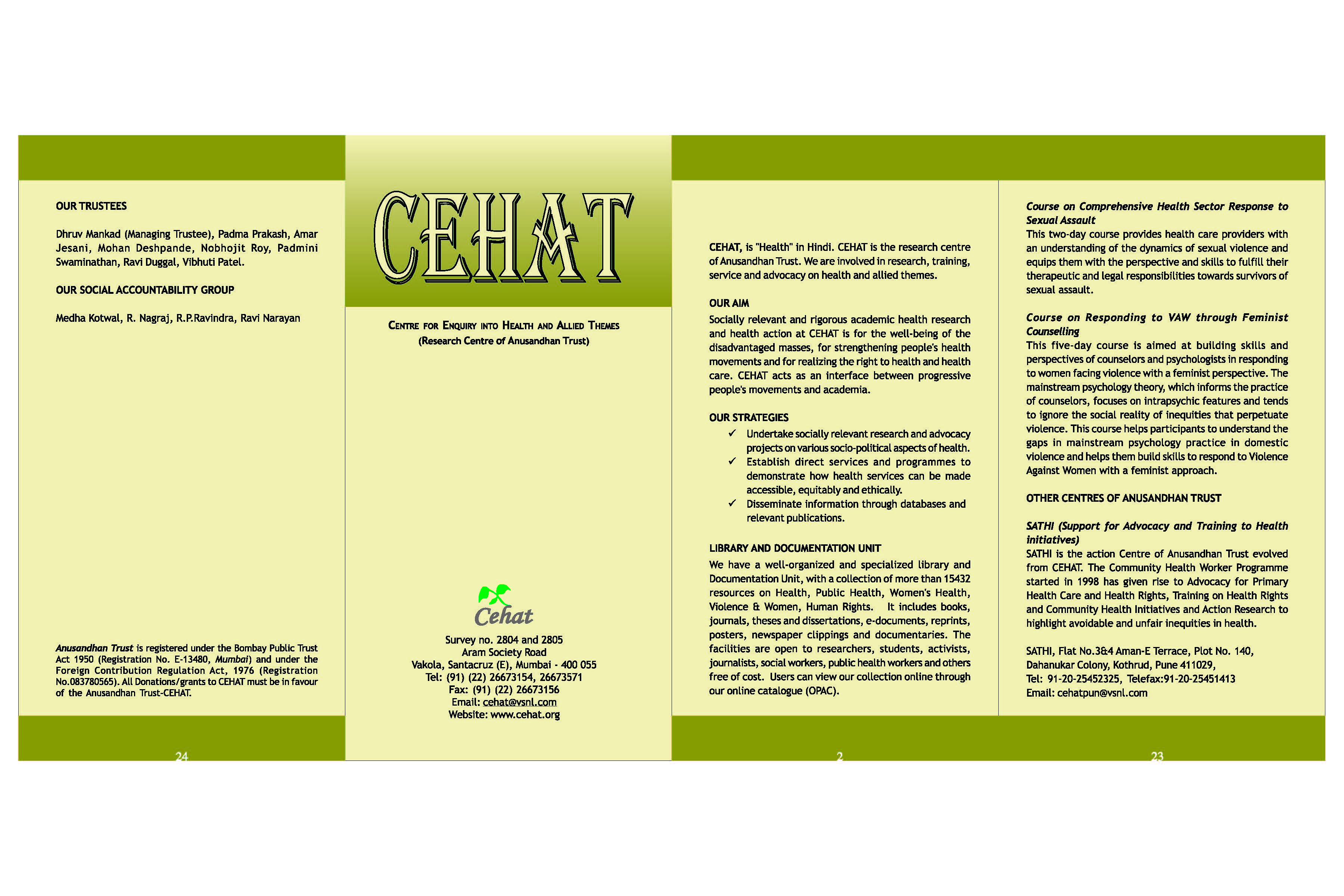 CEHAT, is "Health" in Hindi. CEHAT is the research centre of Anusandhan Trust. We are involved in research, training services and advocacy on health and allied themes.